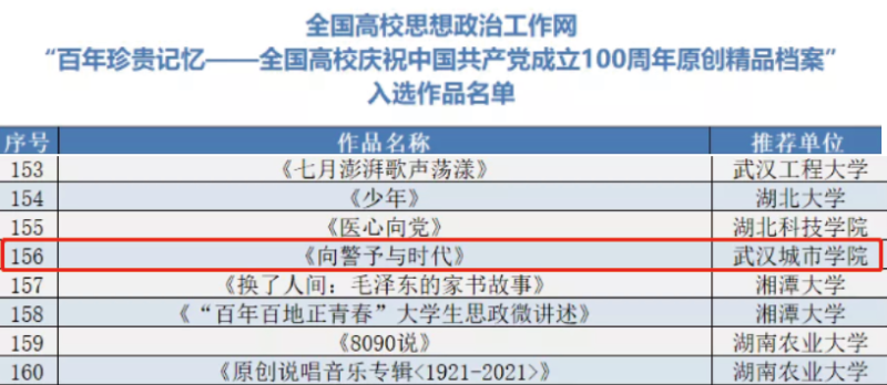 根据《全国高校思想政治工作网关于开展高校庆祝中国共产党成立100周年原创精品推广行动的通知》安排,经组织推荐、专家评审、集中审议等环节,全国高校思想政治工作网择优遴选出225个优秀作品纳入全国高校思想政治工作网《百年珍贵记忆——全国高校庆祝中国共产党成立100周年原创精品档案》。