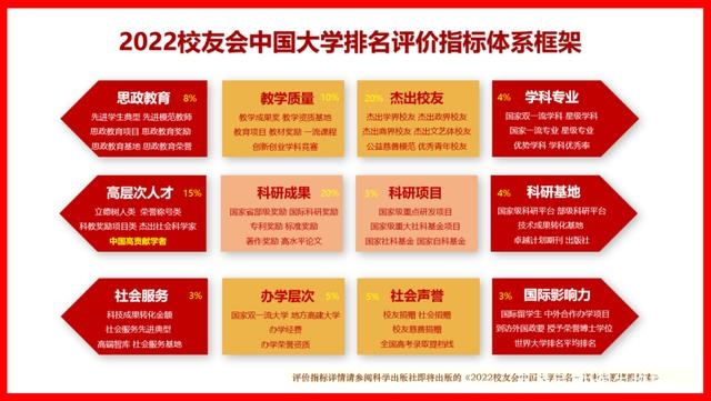自2003年起,艾瑞深校友会网(Cuaa.Net)已经连续20年发布校友会中国大学排名,为全国高考考生提供权威报考指南。2022校友会中国大学排名评价指标体系由思政教育、杰出校友、教学质量、高层次人才、优势学科专业、科研成果、科研基地、科研项目、社会服务、办学层次、社会声誉、国际影响力12大一级指标构成,以服务国家“双一流”发展战略和提升高校服务国家地方经济社会发展能力为导向,涵盖了中国高校核心职能的700多项评测指标。