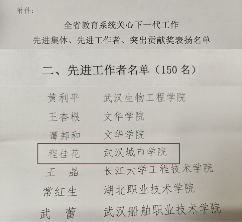 新闻网讯(通讯员 卢一洲)近日,湖北省关工委下发“关于表扬全省教育系统关心下一代工作先进集体和先进工作者的通报”,我校外语学部教师程桂花荣获“先进工作者”称号。