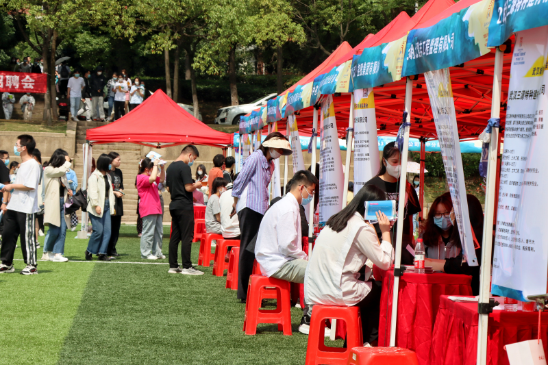 新闻网讯(记者袁晚露 吴冬丽 摄影 吴冬丽 易守勇 钱镜宝 冯甜))5月17日,我校在足球场举办“就在武汉 创赢未来”2022年春季专场招聘会。此次招聘会吸引了宝业湖北建工集团有限公司等74家企业参会,就业岗位涵盖建筑、金融、人力资源、机械制造、旅游管理、计算机、医护、物流、教育培训、房地产、跨境电商等多个行业,就业岗位数1500余个。学校2000余名应届毕业生踊跃入场求职,其中近500名学生达成意向,137名学生现场签约。