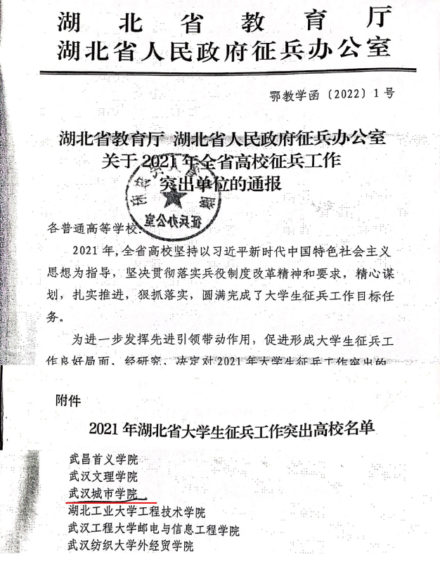 新闻网讯(记者刘宇涵)近日,湖北省教育厅、湖北省人民政府征兵办公室对2021年度全省高校征兵工作实绩突出、圆满完成大学生征兵工作目标的28所高校进行通报表彰。我校荣获“2021年度湖北省大学生征兵工作突出高校”荣誉称号。