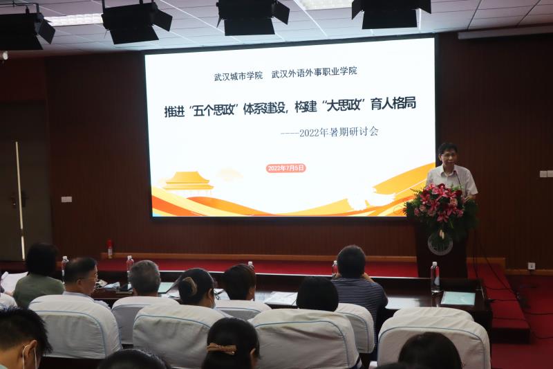 党委书记王军作“推进‘五个思政’体系建设、构建‘大思政’育人格局”主题报告。王军指出,党的十八大以来,习近平总书记对教育工作发表了一系列重要讲话,反复强调“高校立身之本在于立德树人”、“要坚持把立德树人作为中心环节,把思想政治工作贯穿教育教学全过程,实现全员、全过程、全方位育人。学校召开本次暑期研讨会,就是为了进一步贯彻落实习近平总书记讲话精神,举全校之力共同研讨湖北省委高校工委关于“五个思政”工作大计,为下阶段“三全育人”工作谋篇布局。研讨会达成了既定目标,取得良好效果。王军对学校下一步构建“大思政”育人格局提出了三点要求。一是要提高站位,强化“五个思政”体系建设的育人功能。着力推进“学生思政”,强化实践育人;着力推进“教师思政”,强化全员育人;着力推进“课程思政”,强化课程育人;着力推进“学科思政”,强化学科育人;着力推进“环境思政”,强化环境育人。二是要聚焦育人重点,准确把握构建“大思政”育人格局的关键环节。做到学生思政有特色、教师思政有风格、课程思政有特点、学科思政有品牌、环境思政有内涵。三是要夯实工作责任,确保“大思政”育人格局构建取得实效。工作中要做到五个坚持,即坚持问题导向,着力破解学校思想政治工作存在的客观问题;坚持以点带面,确保每一门课、每一名教师、每一个项目都能发挥好育人作用;坚持协同联动,把“三全育人”“五个思政”“大思政”的“软指标”变成“硬约束”;坚持全员参与,努力构建全员、全过程、全方位“三全育人”的大思政教育体系;坚持考评机制,把推进“五个思政”建设情况纳入支部考核指标体系。希望全校上下以暑期研讨会为契机,以时不我待、只争朝夕、奋发有为、永不懈怠的精神状态和干事创业的工作干劲,争做“三全育人”的引路人,“五个思政”的践行者,全力推进学校“大思政”育人格局构建工作,奋力开创新时代学校思想政治和育人工作新局面,创造优异的业绩喜迎党的二十大胜利召开。