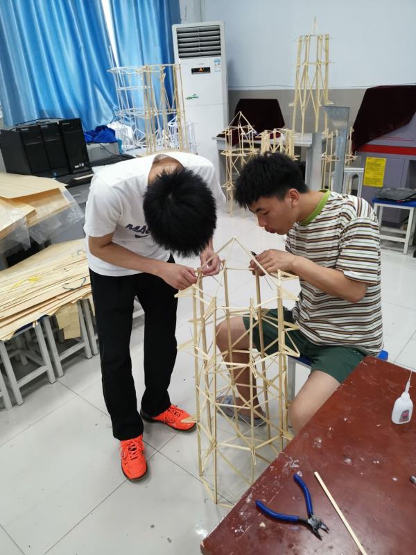 “做梦都梦到自己在做塔。”面对复杂的赛题,参赛队员们首先在平时的练习中克服了时间紧、任务重、材料对身体的影响等多重困难,从校赛结束之后,3个多月的时间,每天除了上课时间之外,空闲时间就顶着大太阳走到城建学部110教室做模型,一直到考试结束余下的半个月,在模型制作室吃喝午睡,累了,就轮流趴桌子上休息,软件使用迈达斯基础在老师们的指导下和自学下从无到有,一步步完善。