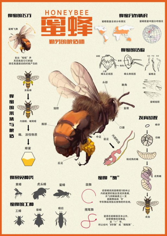 国赛三等奖作品《Fourheavenlykingsofinsects》,作者为2019级视觉传达设计2班学生鲁炳东、李景炜。该作品以信息图表的设计形式,全面展示昆虫界的四大天王,通过插画、文字、动效和声音,介绍它们的分布地区、发育过程、身体结构、生活环境和益用价值等,让观众直观地了解四大昆虫。