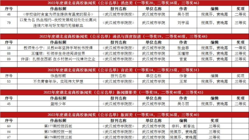 新闻网讯(记者易守勇)近日,2022年度湖北高校新闻奖评选结果公布,我校10件作品获奖,其中一等奖1件、二等奖2件、三等奖7件。