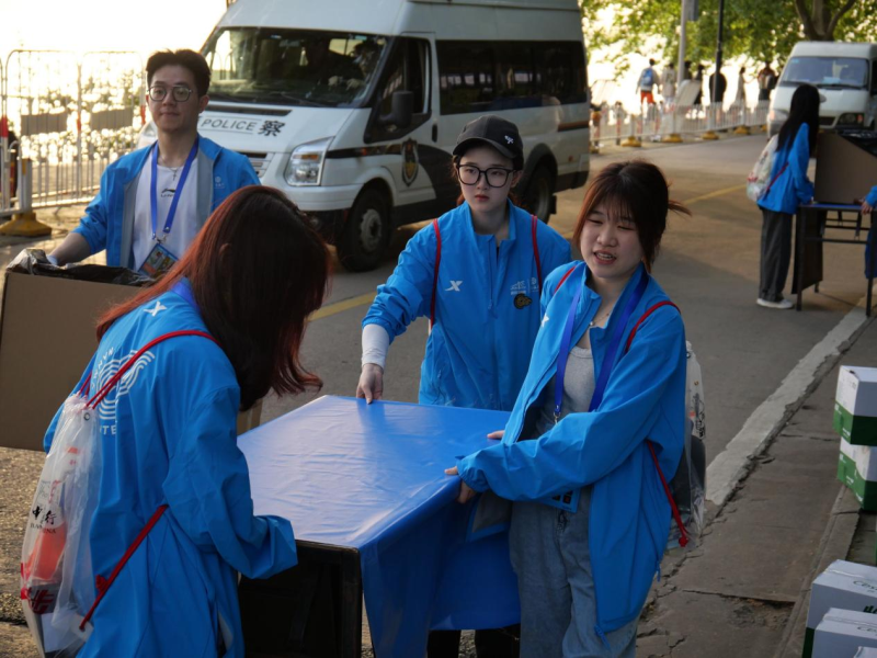 凌晨5点,在晨光熹微时,大巴车到达服务点位。一下车,志愿者们便开始忙碌起来,“男生搬运物资,女生摆放补给物资”,学院党建会志愿服务部部长、汉马志愿者校内组织负责人佟侗有条不紊地安排工作。7点30分,两个服务站点所有准备工作全部完成,26张桌子依次排开,按照汉马组委会要求铺上红、蓝、白不同颜色的桌布,将纸杯摆放在桌面上,倒上水或饮料。