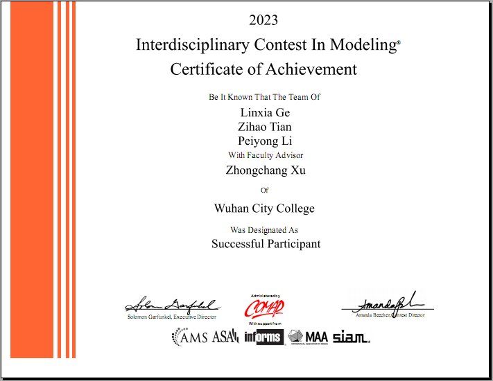 新闻网讯(通讯员 李长伟)近日,2023年美国大学生数学建模竞赛(MCM/ICM)结果揭晓,我院3支参赛队伍全部获奖,其中二等奖(HonorableMention)1项、三等奖(Successful Participant)2项。这是我院学子在该项赛事中首次荣获二等奖,标志着我院数学建模水平正在稳步提高。