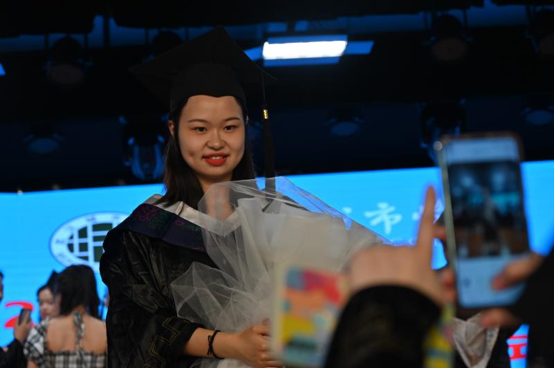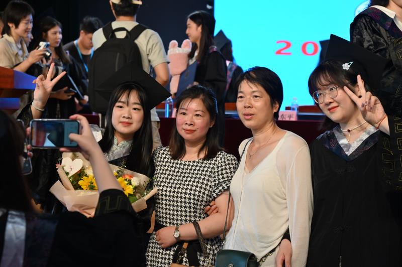 典礼在全场齐唱《歌唱祖国》歌声中落下帷幕。毕业生们拉上三五好友或是与老师合照留念,执手话别。现场还有不少学生家长前来参加孩子的毕业典礼,“彼时是怀着憧憬和不舍送女儿入学,如今是怀着激动和期待去参加她的毕业典礼,四年的时光漫长又短暂,谢谢学校老师的辛勤付出。”经济与管理学部2019级国际经济与贸易专业3班学生金馨怡的母亲专程驱车3小时来到毕业典礼现场见证这一弥足珍贵的时刻。