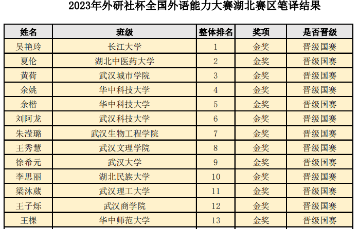 在此次举办的笔译赛项中,我院外语学部两位学生与来自全省包括武大、华科等知名高校的126位学生同台竞技,她们顶住压力,以良好的心态和备赛时积累的翻译实力取得了优异成绩。特别是黄荷同学,更是以第三名的佳绩获得了湖北省金奖,将与另外12位学生一起代表湖北省参加国赛。这是自国才杯举办以来,我院首次有学生闯入国赛,体现出我院外语专业学生卓越的专业能力。