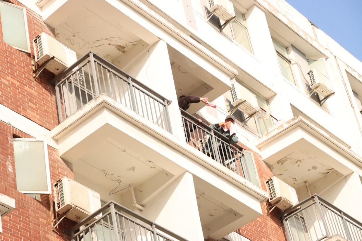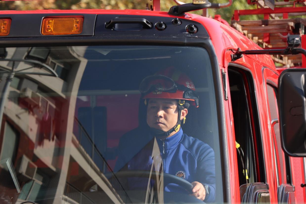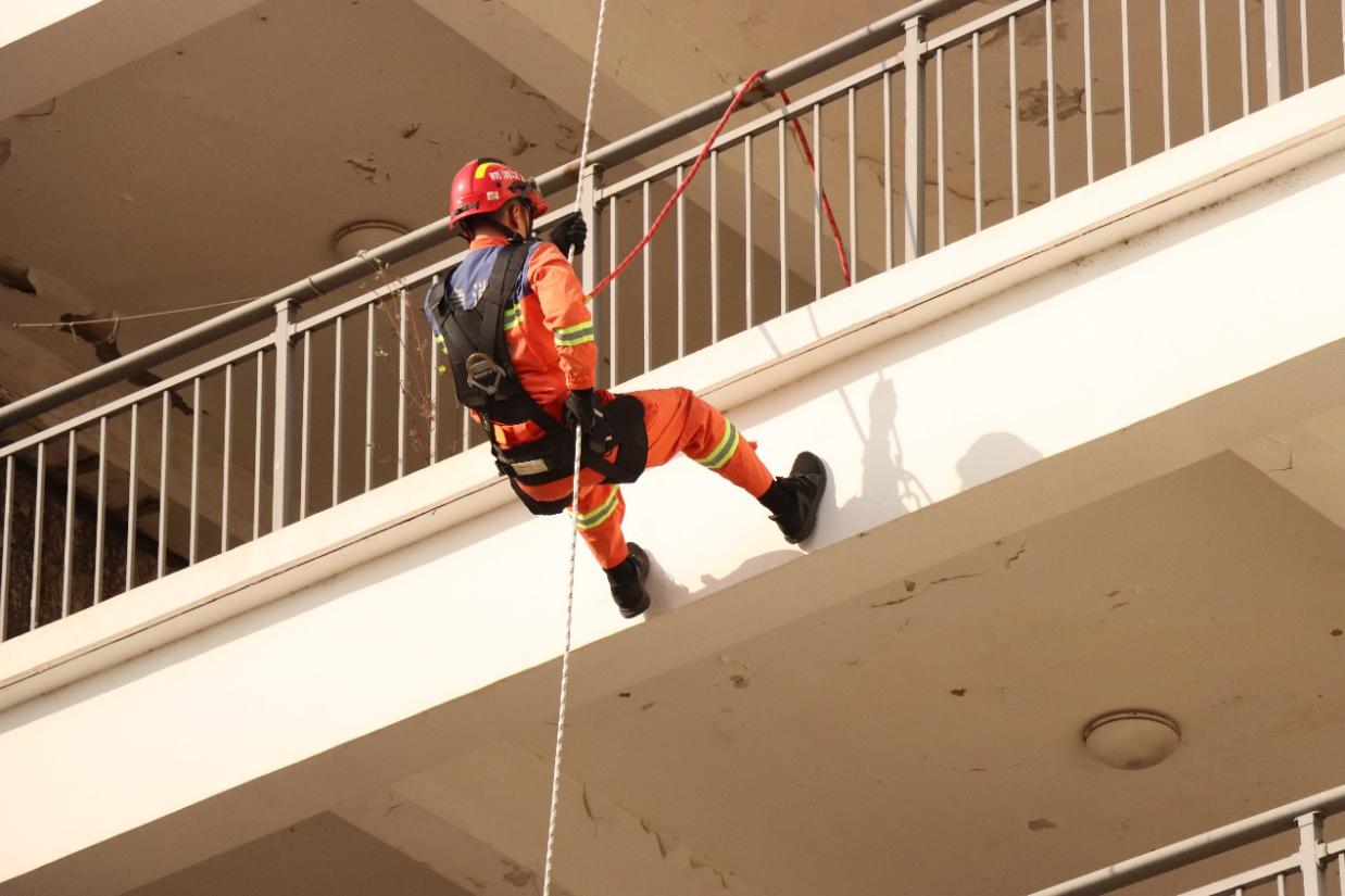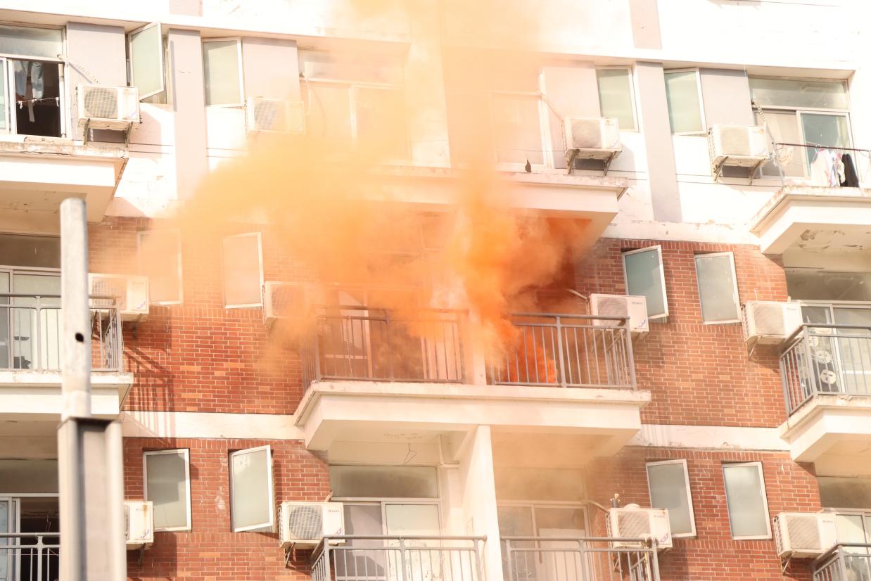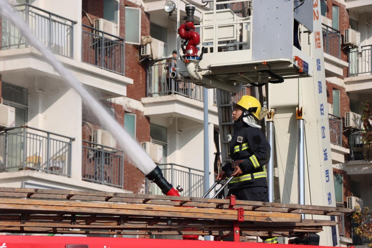 紧接着,消防车启动阀门,3名消防员合力将两个多功能水枪对准失火楼栋进行灭火。与此同时,位于五楼的消防员也利用救生绳展开营救行动。