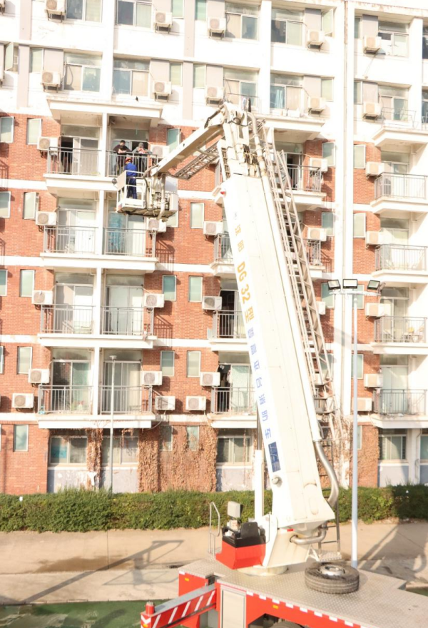 救援工作继续推进,消防战士操纵的曲臂登高车升起,在五楼形成施救平台,对被困学生实施救助,此时全场目光都集中在此,在消防员的指导下,被困学生被成功救出。