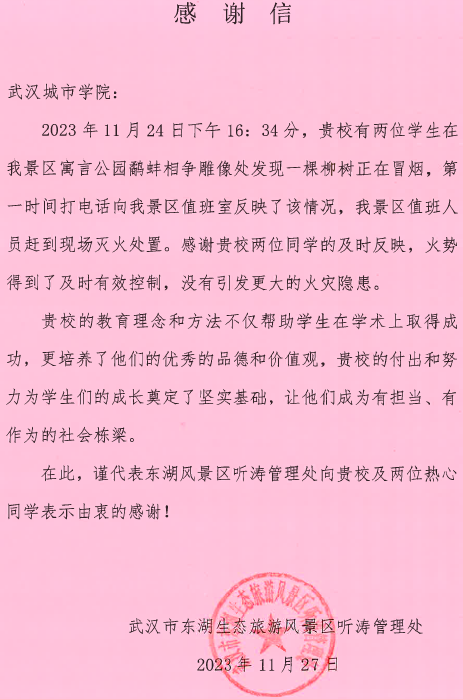 新闻网讯(高级记者 张佳鑫)“在此,谨代表东湖风景区听涛管理处向贵校及两位热心同学表示由衷的感谢!”近日,学院收到来自武汉市东湖生态旅游风景区听涛管理处送来的感谢信,对我院2023级艺术与设计学部学生潘嘉瑞、董鑫源在景区内发现火情临危不惧、挺身而出的勇敢行为表示感谢。
