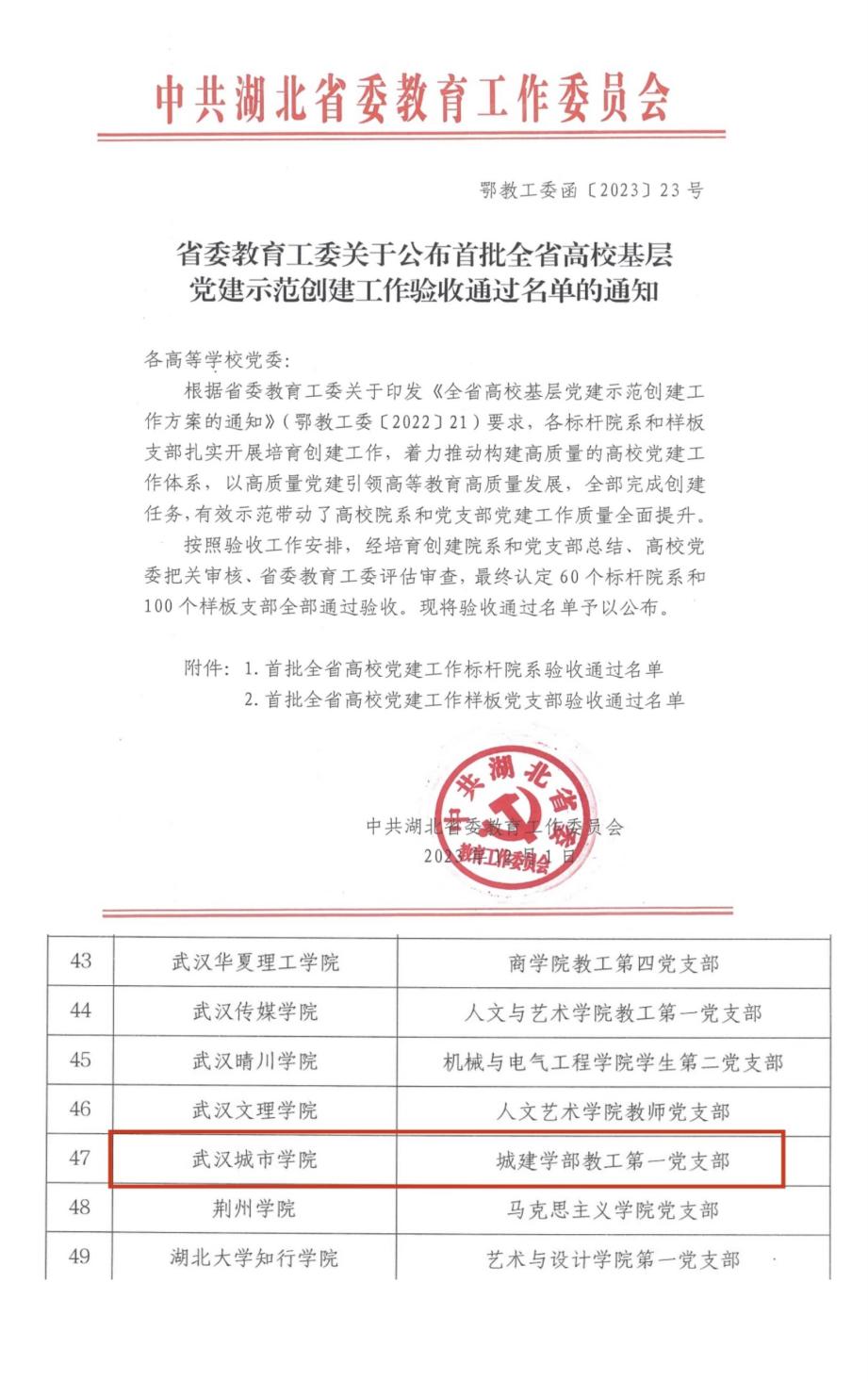 新闻网讯(通讯员关晓玲)12月1日,湖北省委教育工委公布《省委教育工委关于公布首批全省高校基层党建示范创建工作验收通过名单的通知》,我院城建学部教工第一党支部作为首批“全省高校党建工作样板支部”培育创建单位顺利通过验收。