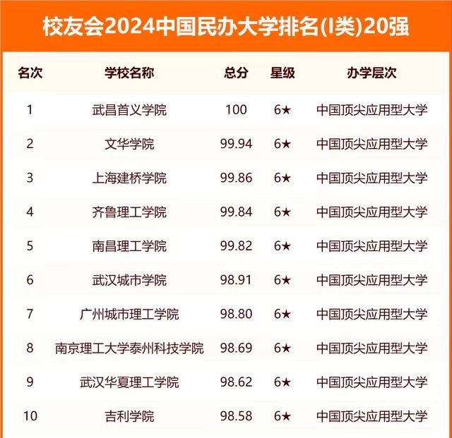 新闻网讯 (记者欧阳镅珍)近日,全国第三方大学评价机构艾瑞深校友会网发布《2024校友会中国大学排名》,我院以98.91分位列2024中国民办大学排名I类第六名,获评6星级中国顶尖应用型大学,稳居民办院校前列。