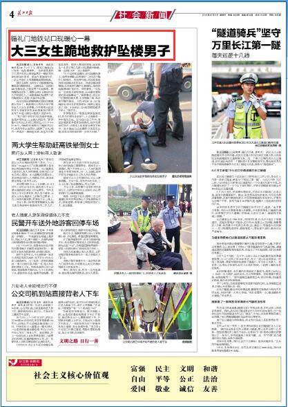 新闻网讯(记者 夏书婷)10月2日下午,我院医学部2015级高级护理专业学生彭梦雅在循礼门地铁站J口偶遇一起坠楼事件,彭梦雅义无反顾冲上前双膝跪地现场施救,被《长江日报》融媒体誉为“展开了一场教科书般的急救”。我院优秀学子在关键时刻毫不犹豫挺身而出,具备扎实的基本功和实操能力,将日常所学所练真正用到了实处。以下为转载《长江日报》10月5日第四版刊登的报道原文。