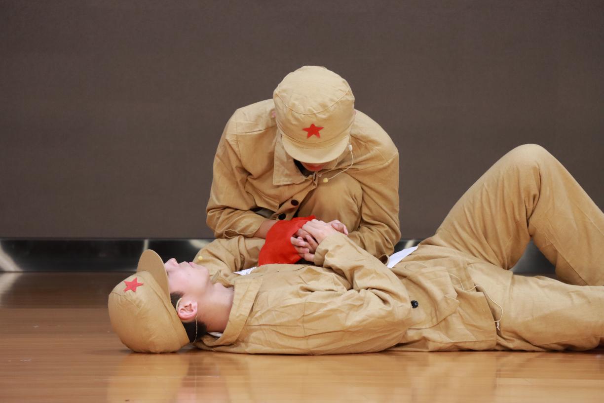 随着灯光缓缓暗下,故事回到了起点,小孩与吴兵相遇,这时国家强大了,会场播放着我国发射人造卫星和建设天宫空间站的喜讯,小孩的眼神中闪烁着对祖国强大的自豪,感染在场的每一个人,在祖国繁荣富强的道路上,都要有着自己的使命和责任,为祖国的发展贡献自己的力量。