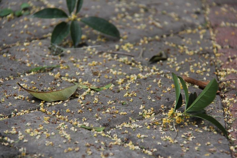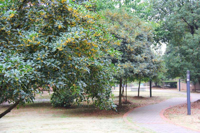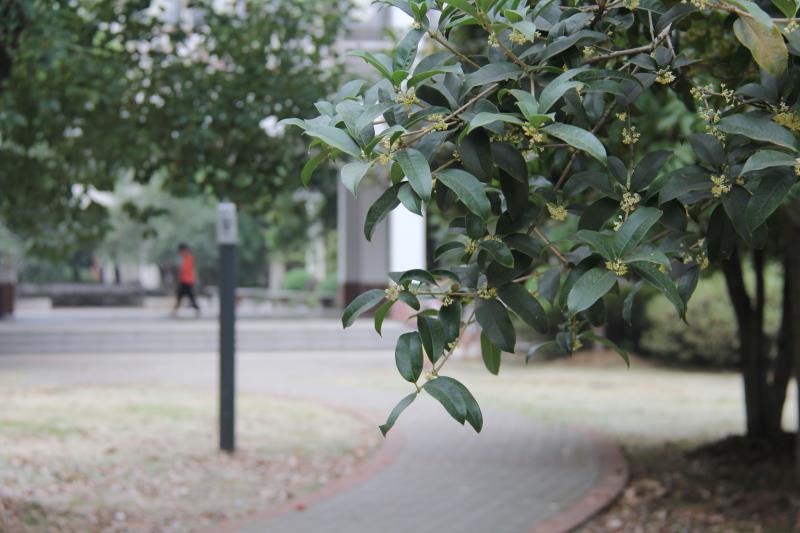 沁人心脾的馥郁芳香随风萦绕,四叶花瓣、数点黄蕊、一茎青梗,攒在一起便是一朵朵轻柔的桂花,为这清秋季节平添不少香气。一阵秋风袭来,枝叶“沙沙”作响,花瓣飘散而下,地上铺满金黄。开花时奉献幽香,花散时坦然入地,走在学院桂花树下的师生,享受着这一路的清软香氛,珍惜着每年此刻似玉生香的黄色精灵。