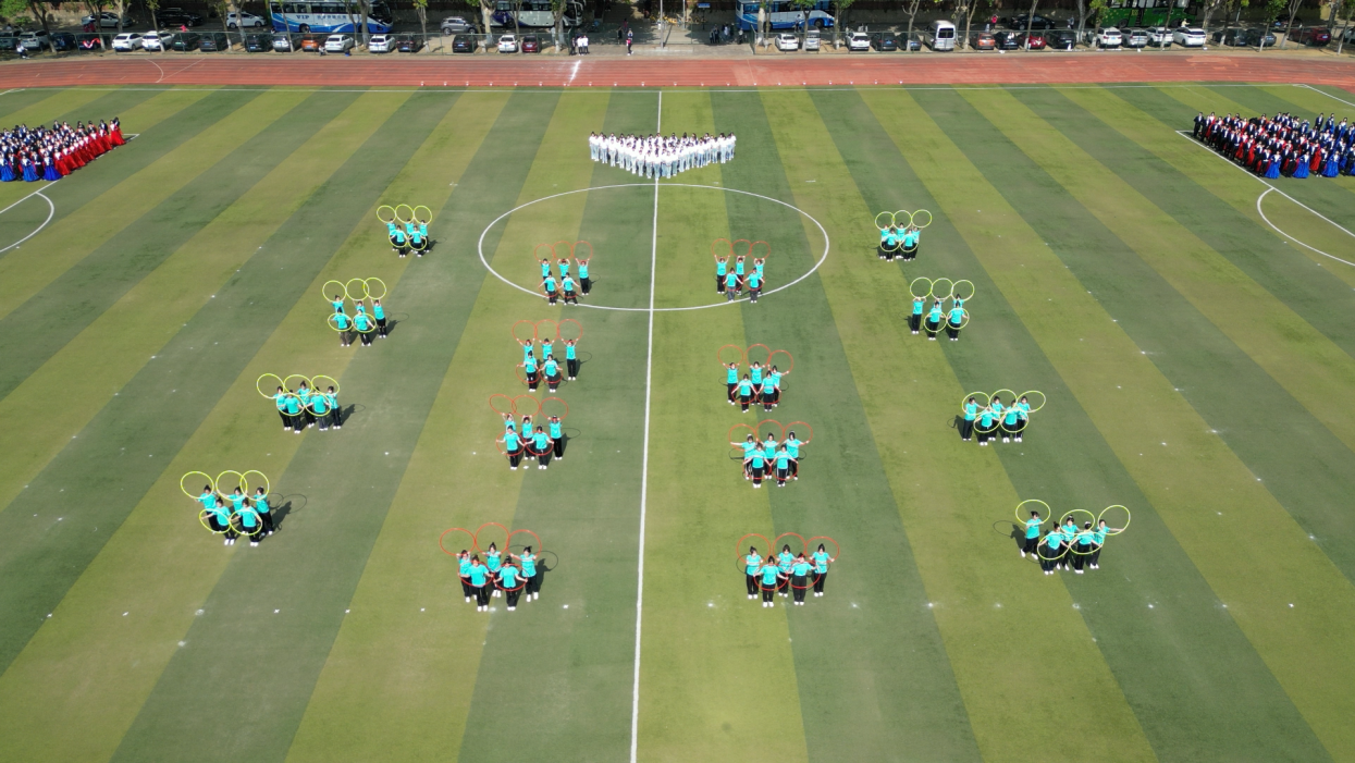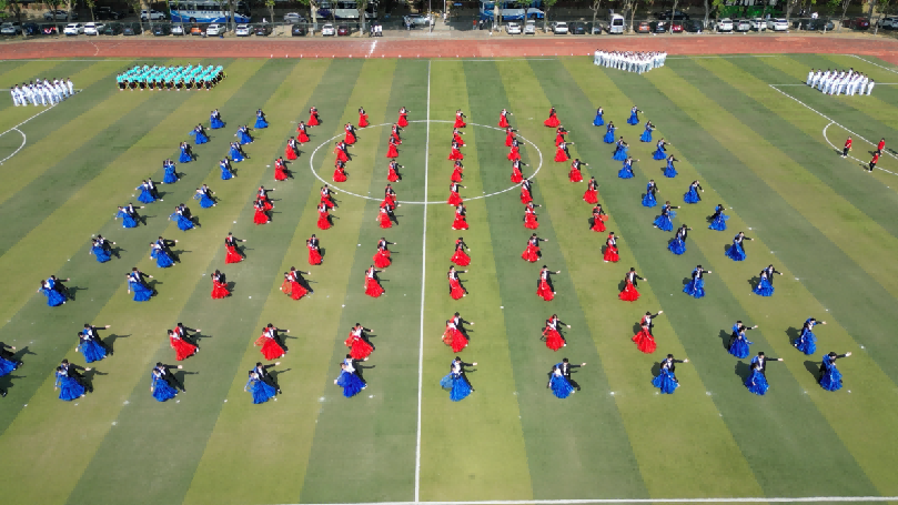 100位教师共同献上的团体操,“山河壮丽”“同心共圆”“时代强音”“强国有我”四大篇章的精彩大联排,在运动场汇聚成一道道独具特色的风景线。
