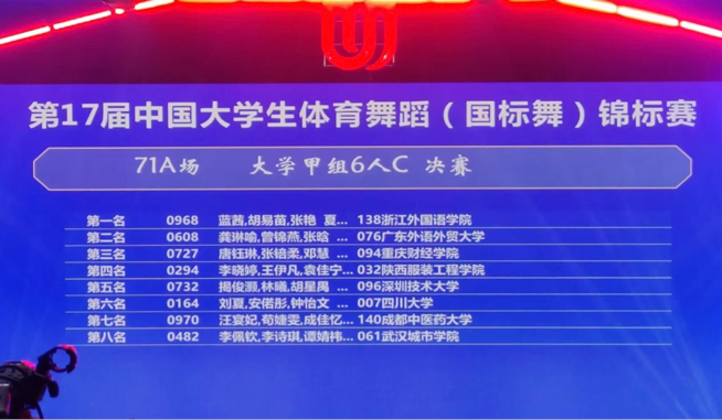 新闻网讯(通讯员胡萍)5月27日至30日,由教育部中国学生体育联合会主办的第17届中国大学生体育舞蹈(国标舞)锦标赛在四川省绵阳市九洲体育馆隆重举行。我校由体育教学中心主任马浩林担任领队,胡萍、胡冰砚、彭辉担任教练,共选派8名运动员参赛,取得了大学甲组6人J第七名、大学甲组6人C第八名的好成绩。这是整个团队艰苦训练的结果,也是我校体育舞蹈代表队团体精神具象化的显现。