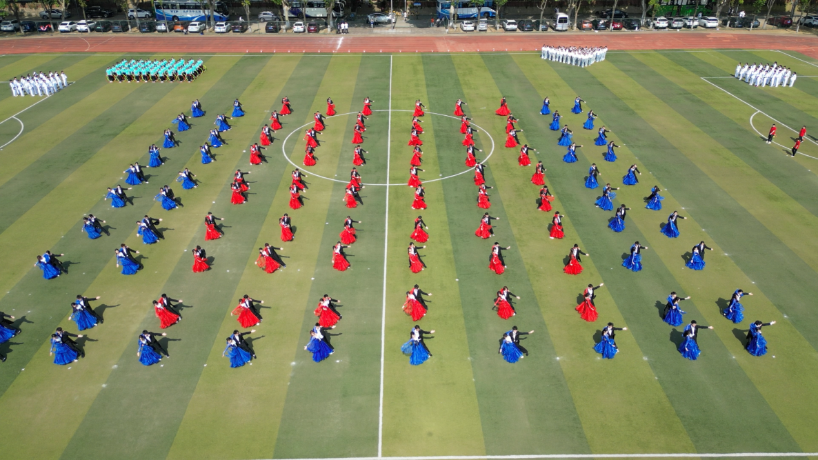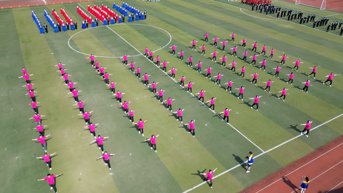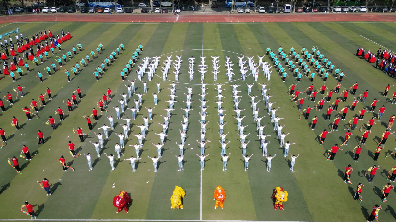 “山河壮丽”篇章中,身着华美礼服的维也纳华尔兹舞者,以曼妙的舞步,在阳光下翩翩起舞,他们手挽手,一步一步地旋转起来,成为了一幅绝美的画卷,宛若画笔般勾勒出祖国山河的雄伟与瑰丽。“同心共圆”篇章,巧妙地将艺术体操的圈操、柔力球与彩带龙等元素融合在一起,展现出团结合作、和谐共生的主题。他们的动作流畅而优美,仿佛在空中绘制出一幅绚丽多彩的图案。“时代强音”篇章,学生们以跆拳道表演为主轴,展示着城院学子们强健的体魄和奋发向上的精神风貌。他们身姿矫健,动作准确,每一次腿踢、拳击都充满了力量和激情,正如一支铿锵的乐章,奏响着青春的强音。“强国有我”更是将现场气氛推向了高潮,620人同时在场上进行舞狮、拉丁舞等表演,将传统文化与现代元素巧妙融合,既有传统文化的韵味,又有现代时尚的气息,展现了城院学子们对国家的文化自信与活力。
