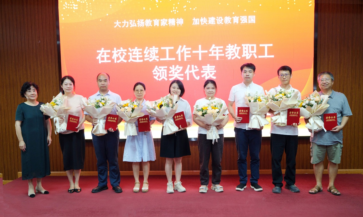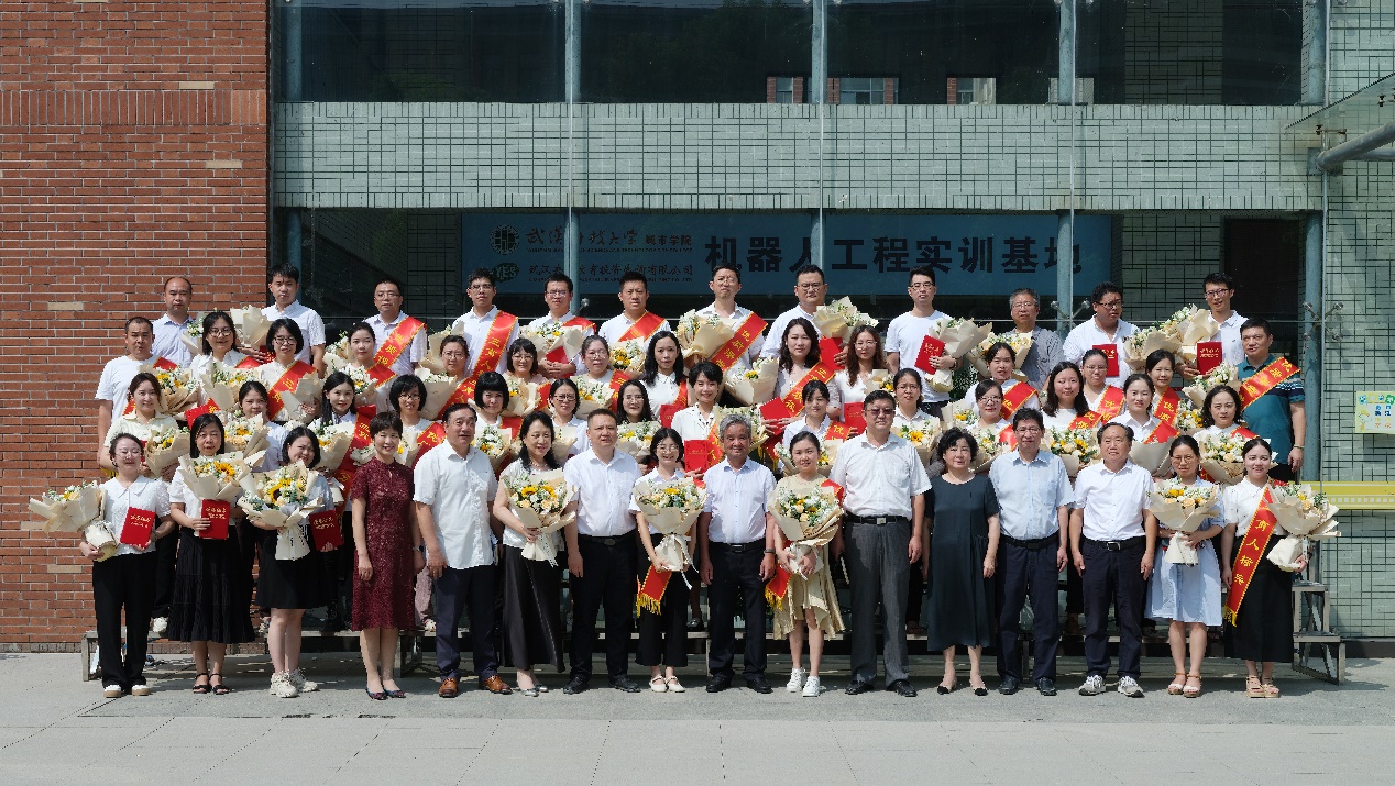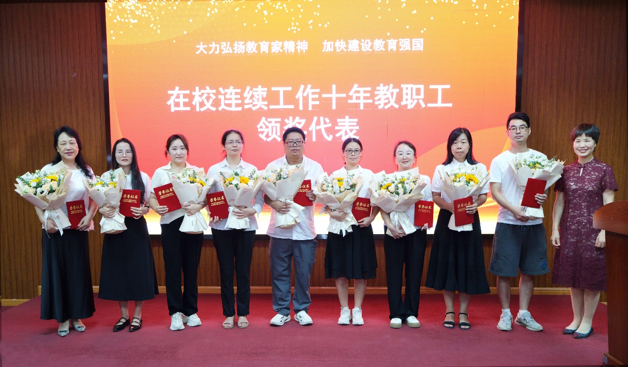 表彰大会后,受表彰的教职员工代表与学校领导一起合影留念。
