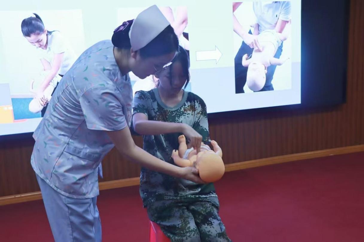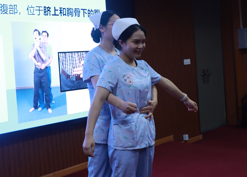 讲座最后,儿科的吴燕老师和她的团队共同为大家演示了海姆立克急救法,并邀请同学们上台参与体验,同学们踊跃参与,在学习收获知识的同时,也得到了精美礼品。