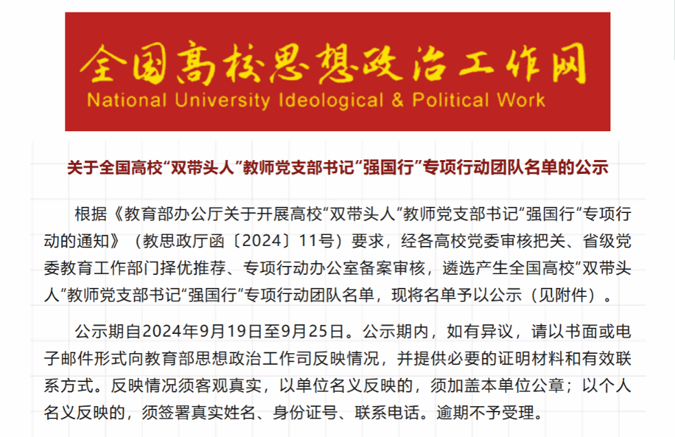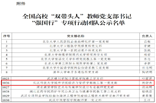 新闻网讯(通讯员 关晓玲)近日,教育部思想政治工作司对全国高校“双带头人”教师党支部书记“强国行”专项行动团队名单予以公示,我校经济与管理学部教工第一党支部书记何舒卉作为团队负责人入选。