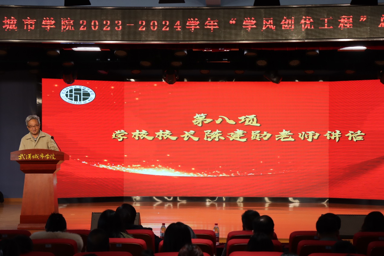陈建勋校长作总结讲话。他对受表彰的集体和个人表示热烈祝贺,并对在优良学风创建工作中辛勤付出的师生表示崇高敬意。他强调,我校始终高度重视优良学风创建工作,将优良学风作为学校优良传统的重要组成部分,我校学风建设也取得显著成绩,我校早晚自习和正课出勤率平均达95%以上,考研率一直稳定在11%以上,就业率稳定在90%以上,学校每年有5000余人次在校外学科和课外科技竞赛中获奖,获奖率已经达到23%以上,特别是在去年举行的第十八届“挑战杯”全国大学生课外学术科技作品竞赛中,我校艺术与设计学部钱宇老师指导的参赛作品斩获国赛一等奖,实现我校在该项赛事中的历史性突破,这在民办高校中是非常骄人的成绩。为进一步加强学生教育管理工作,持续打造优良学风校风和学生综合素质,他提出三点希望:一是希望学校各部门、各学部提高工作意识,狠抓落实学风校风建设,重点做好“六抓六促”工作,抓学生成才目标,促学风建设重点,抓学生遵纪守法学习活动,促学生自觉提升文明行为,抓学生早晚自习管理,促学生自觉性学习,抓班风建设,促班风提升,抓考风考纪教育,促良好考试氛围,抓校园活动建设,促学生学习上进;二是抓好四支队伍建设,保障优良学风形成,各职能部门要发挥建设优良学风的重要作用,将学风建设引入规范化、制度化轨道,任课老师要自觉提高师德水平、执教能力和课堂教学质量,指导学生掌握正确的学习方法和良好的学习习惯,辅导员和班主任要积极配合教学和学生日常管理,加大对课堂、寝室、自习室的监管力度,各级学生干部、学生骨干要充分发挥主观能动性,促进学生自我教育、自我管理;三是希望广大学生担负起学习的职责,切实发挥在学风建设的主体作用,把加强学风建设内化为自己的主观要求,在学习过程中要充分发挥自主意识,端正学习态度,明确学习目标,掌握学习规律,提高学习效果,认识到持续学习的重要性,使终身学习从一种理念变为自觉实践,争做德才兼备的新时代青年楷模。