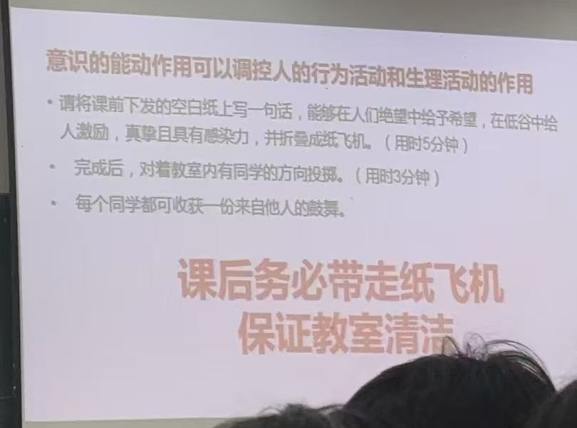 “当恩格斯把‘思维着的精神’誉为‘地球上最美的花朵’时,他预见的就是这种充满温度的创造性实践。”熊晶老师拿着学生制作的纸飞机解释道。课堂上,熊晶老师让每个人写下一句充满希望的话,折成纸飞机并随机飞给他人,飞机降落后,2023级医学部护理专业学生杨航拆开了带有“勇往直前,不畏艰难”这句祝福的纸飞机时感触颇深:“当看到陌生笔迹的鼓励在空中划出弧线,我突然就理解了意识对行为的正向引导。”