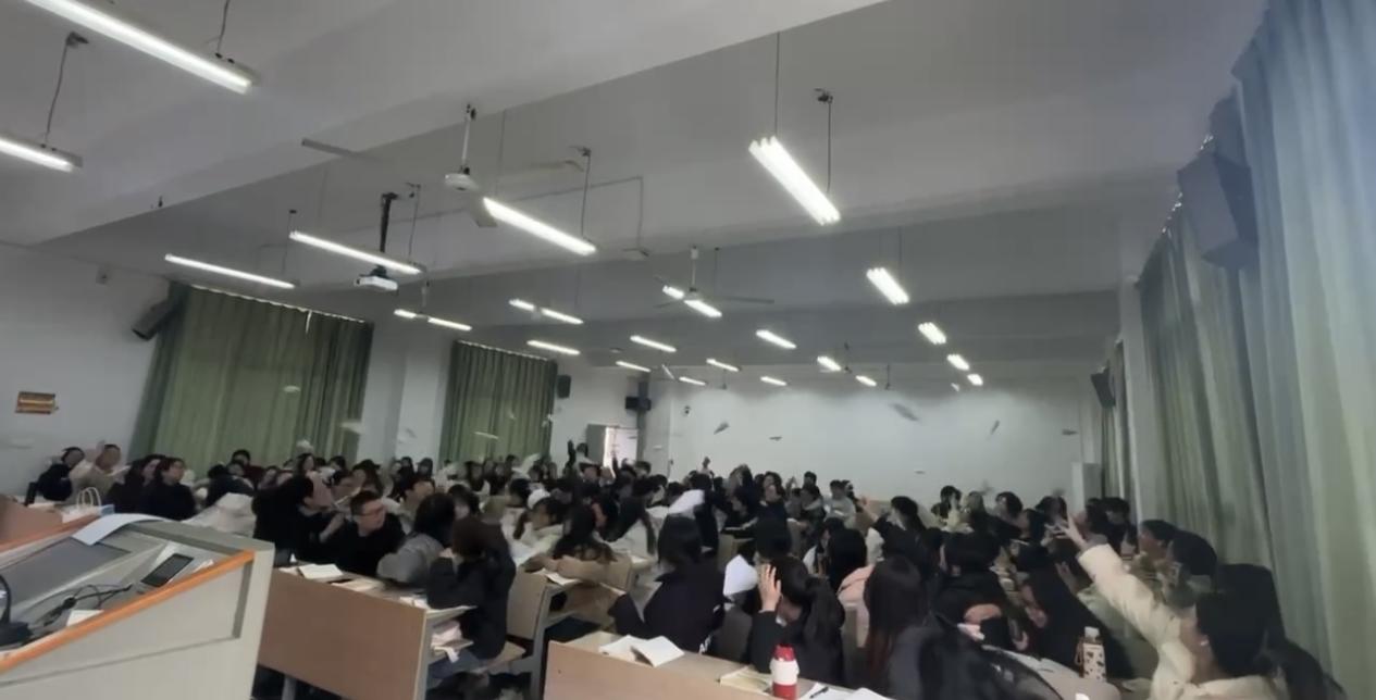 新闻网讯(记者许佳仪)“3、2、1,放飞!”随着熊晶老师一声令下,护理五、六班的教室里瞬间腾起五十余架纸飞机。这并非普通的课堂游戏,而是我校熊晶老师在马克思主义基本原理课程中对“意识的能动作用”专题的沉浸式教学现场。学生们通过书写励志话语折成纸飞机传递的独特方式,亲身感受着“文字的花朵”——人类思维力量的绽放。