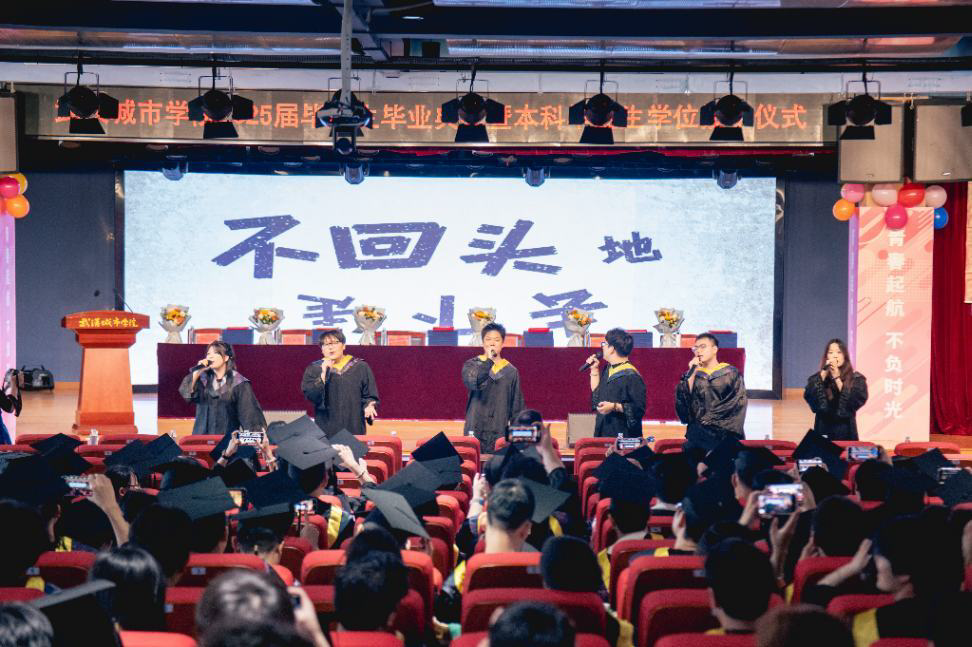 “再见了相互嫌弃的老同学,再见了来不及说出的谢谢……” 毕业典礼启幕前,六名毕业生联袂献唱《不说再见》《记念》《你曾是少年》《再见》,用歌声致敬青春,诉说离别。大屏幕温情播放了辅导员的寄语视频,谆谆教诲与真挚祝福交织,为这场深情告别增添温暖注脚。