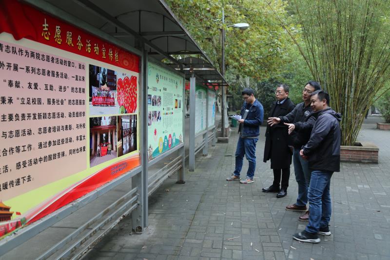 文明办一行还检查了我院文明创建工作近两年的台账,并深入校园进行了实地考察。按照《武汉市文明单位动态管理考核测评标准》,用“对标检查”的方式,查漏补缺,规范台账,对我院文明创建工作有指导性意义。实地考察中,文明办一行人对学院浓厚的文化氛围十分满意。