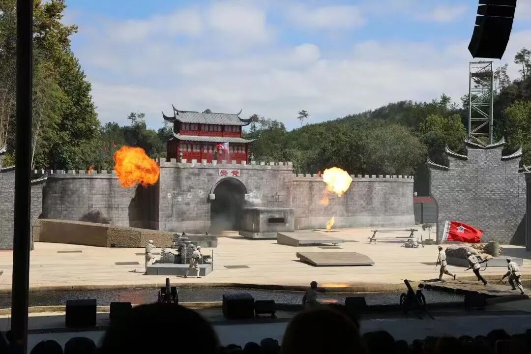 当日下午,师生们前往第二站——“红安永远红”实景剧场,观看大型红色实景剧《红安永远红》。该剧以毛泽东同志对红安的谆谆教诲为精神指引,以红安本地革命烈士戴氏兄弟为原型。演出过程中,演员们以真挚的情感、生动的演绎,搭配实景搭建的战壕、村落等场景,将观众带回烽火连天的革命年代。同学们纷纷挺直腰背,目光紧紧锁定舞台。当剧情推进到战友为掩护其他人壮烈牺牲的高潮部分,现场瞬间陷入寂静,有同学忍不住掏出纸巾擦拭眼角,连原本偶尔的轻声交流也完全停止,所有人都沉浸在剧情里,仿佛亲身经历了那段战火纷飞的岁月。演出结束后,师生们自发起身鼓掌,掌声持续了许久,既是为演员们的精彩演绎,更是向革命先烈致以最诚挚的敬意。25级工商管理二班的雷琪感慨道:“第一次这样身临其境感受历史,课本里的英雄,都是这样有血有肉的人,这场表演太震撼了!”
