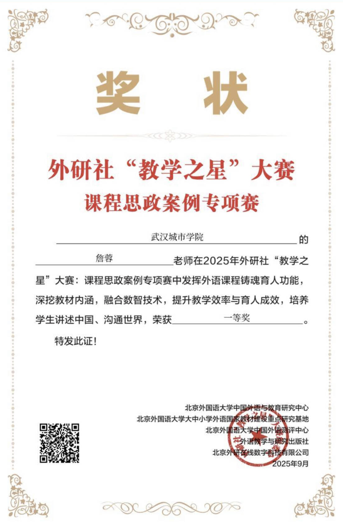 外研社“教学之星”大赛课程思政案例专项赛是为全面推进高校外语课程思政高质量建设而设立,旨在推动高校外语教师以习近平新时代中国特色社会主义思想为指导,落实立德树人根本任务,搭建课程思政育人实践交流平台。詹蓉老师此次获奖,充分体现了其在思政育人与语言教学融合方面的深入探索与创新实践。
