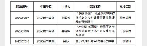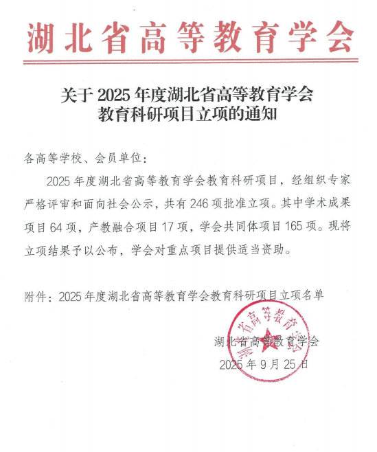 新闻网讯(通讯员 陈伊兰)9 月 25 日,湖北省高等教育学会正式公布 2025 年度教育科研课题立项名单。武汉城市学院再传捷报:医学部申报的 3 项产教融合类课题全部获批,其中重点项目 1 项、一般项目 2 项,充分展现了学校在产教融合领域的科研实力与实践探索成效。