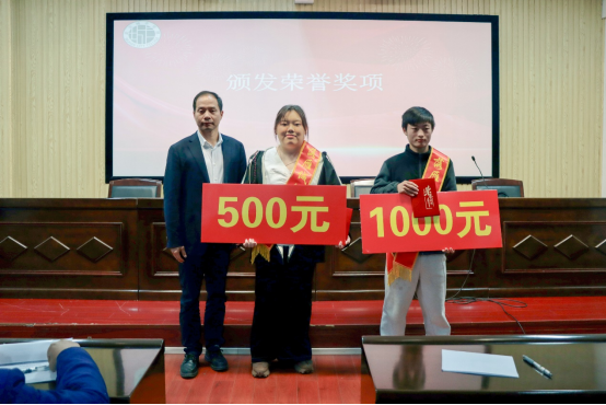 颁奖环节,团委书记王薇薇为两位同学颁发荣誉绶带,经济与管理学部党总支副书记毛军杰为他们颁发奖金,全场以热烈的掌声向两位同学表示祝贺。