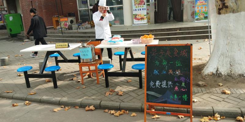 献血点旁还设置了休息处,标有“献血英雄可免费过来领取红糖水、山楂等零食。”不少学生献血后在休息处喝上一杯暖心的红糖水,吃点山楂等零食补充体力,他们纷纷为这一做法点赞。休息处负责人、食堂徐清霞经理说:“天气寒冷,我们后勤工作人员在献血点旁设置休息处,让献血者一下采血车就可以喝一杯暖暖的红糖水,补充体力。”