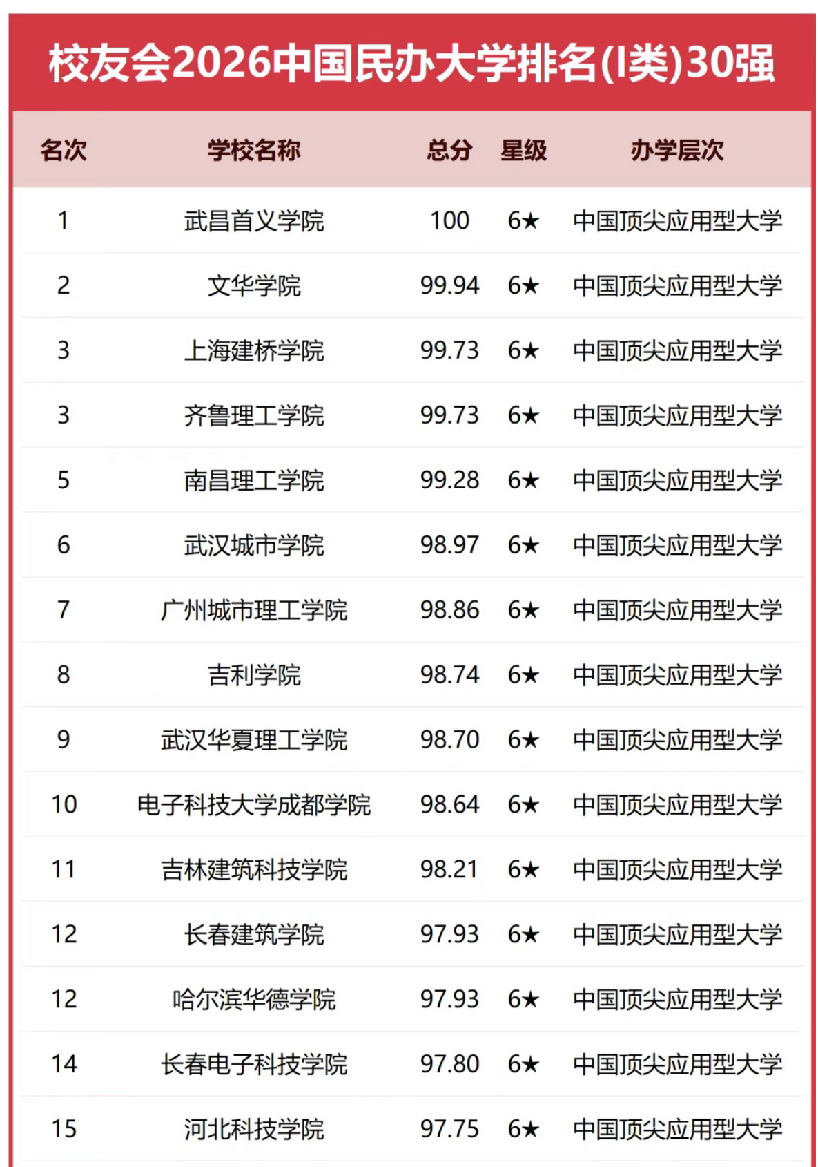 新闻网讯(记者 王奕)近日,全国第三方大学评价机构艾瑞深校友会网发布《2026校友会中国大学排名》,我校以98.97分位列2026中国民办大学排名I类第六名,获评6星级中国顶尖应用型大学,稳居民办院校前列。