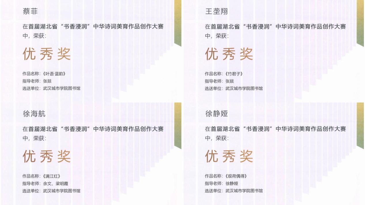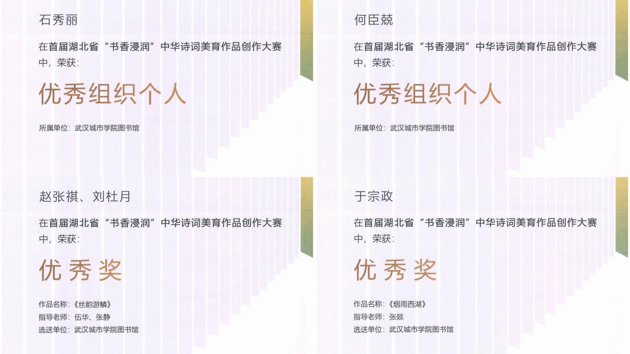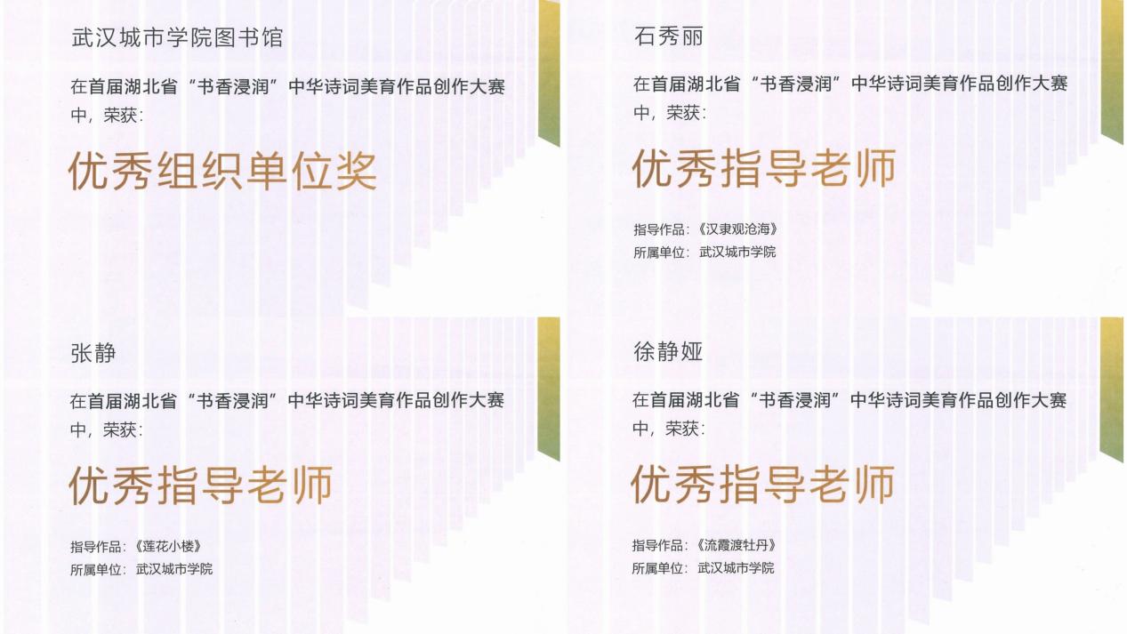新闻网讯(通讯员 石秀丽)近日,首届湖北省“书香浸润”中华诗词美育作品创作大赛评选结果正式公布。我校在此次比赛中表现突出,荣获“优秀组织单位”称号,师生及工作人员亦斩获多项个人奖项,充分展现了我校在传承中华优秀传统文化与推进美育实践中的工作成效。