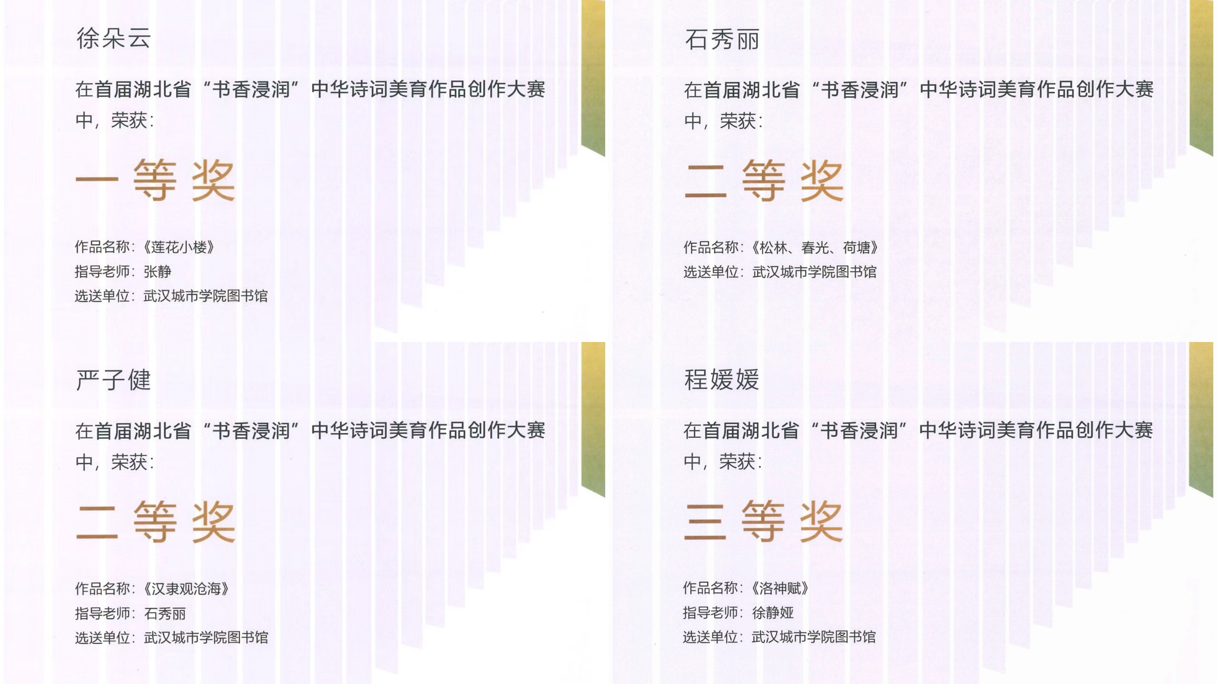 本次大赛中,我校学生作品成果丰硕。2023级经济与管理学部会计3班徐朵云同学的立体木雕《莲花小楼》荣获一等奖;2022级城建学部城乡规划1班严子健同学的书法《汉隶观沧海》荣获二等奖;2022级艺术与设计学部服装1班程媛媛同学的《流霞渡牡丹》获得三等奖;蔡菲同学、王垄翔同学、徐海航同学、于宗政同学、赵张祺同学、刘渡月同学获得优秀奖。教师队伍同样成绩亮眼:艺术与设计学部张静老师、徐静娅老师、图书馆石秀丽老师获评“优秀指导老师”;图书馆石秀丽老师与何臣兢老师获“优秀组织个人”;图书馆石秀丽老师的国画《松林》获二等奖。师生齐心协力,共同展现了我校浓厚的文化素养与美育风采。本次大赛由湖北省美育研究会主办,依托“阅途美育在线”数字平台,面向全省高校师生征集基于中华古诗词创作的静态与动态艺术作品。大赛以“书香浸润,美育中华”为主题,注重诗词意境美、音律美与现代表达的融合,旨在激发师生创作热情,探索高校美育创新路径,为全省院校搭建了优质的交流展示平台。活动自启动以来,得到广泛响应,共吸引59所高校1060名选手报名,经严格审核,共有688件作品进入终评,竞争激烈。