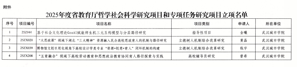 新闻网讯(通讯员 陈伊兰)近日,湖北省教育厅发布了《关于2025年度哲学社会科学研究项目和专项任务项目立项的通知》(鄂教思政函〔2025〕1号),正式公布了立项名单。我校在本次项目申报中表现突出,共有4项课题成功获批立项,其中指导性项目1项、专项任务项目3项(详见下表),充分彰显学校在哲学社会科学研究领域的扎实功底与育人探索的深度。