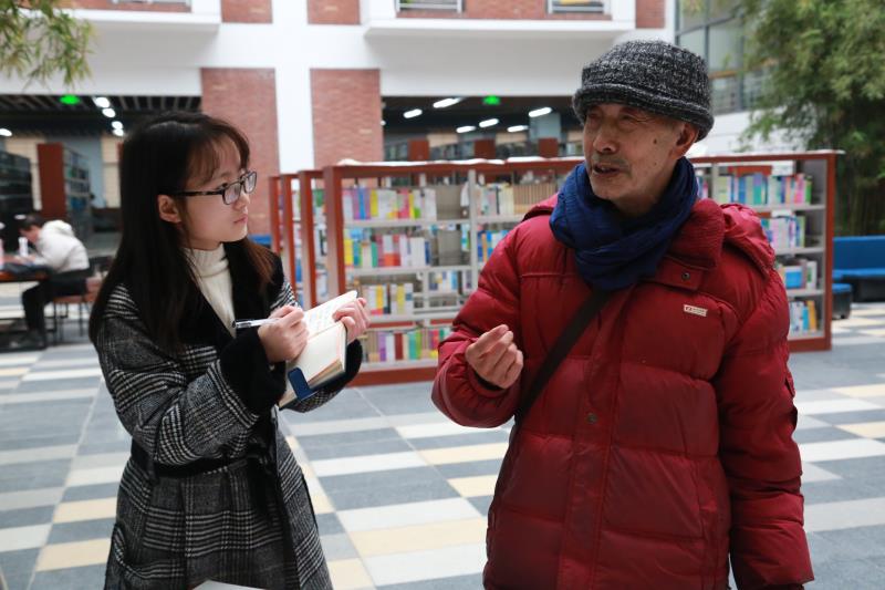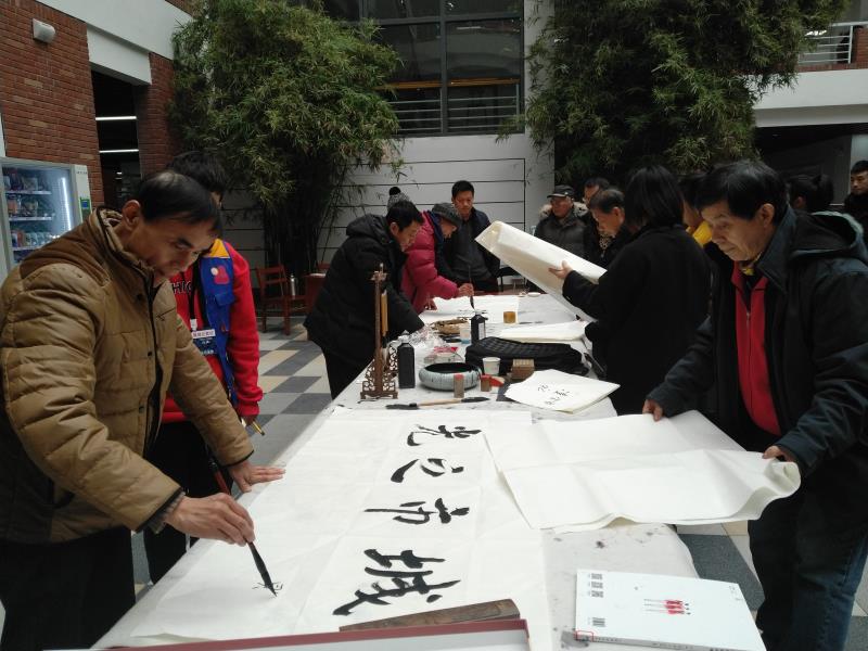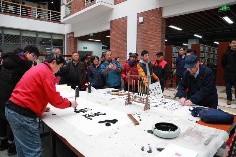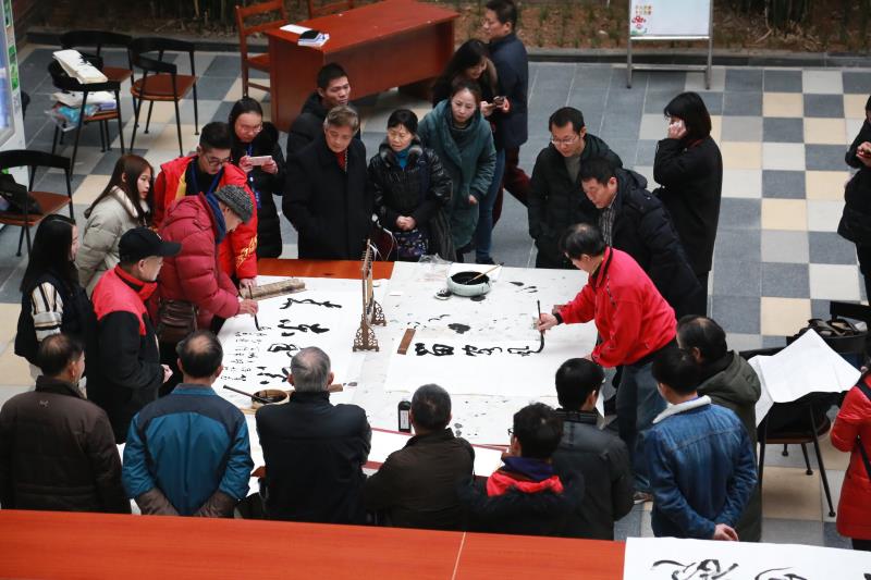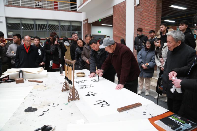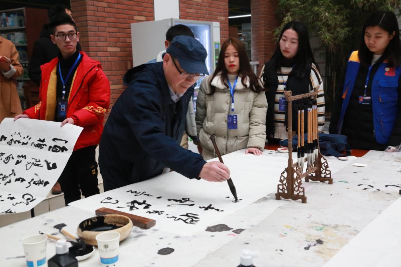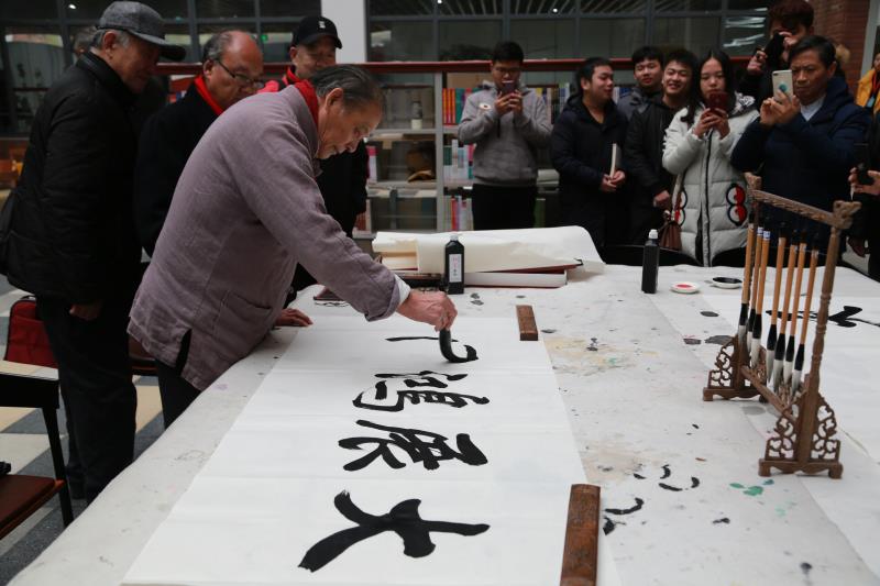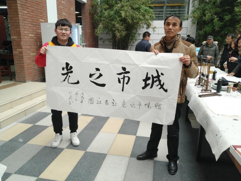 起笔、顿笔、提钩、收锋,“天道酬勤”四个大字在书法家的笔下一气呵成,赢得现场老师及学生阵阵喝彩。天空时不时飘起毛毛雨,寒风也有些刺骨,可在图书馆一楼临时搭起的条案前气氛十分热烈,书法爱好者都想一睹书法家挥毫泼墨的风采,不少人拿着画纸排队在现场求墨宝。八旬书法专家左国望即兴挥笔,为我院学工处、艺术学部、城市之光记者团题字。他感慨:“这几幅书法作品表达了我对此次展览成功举办的祝福,同时也是对武汉科技大学城市学院的美好期望。适逢盛世,习主席提倡学习传统文化,希望莘莘学子能紧跟时代步伐,学习和弘扬祖国的优秀传统文化。”(记者 宁婉颖 聂威)