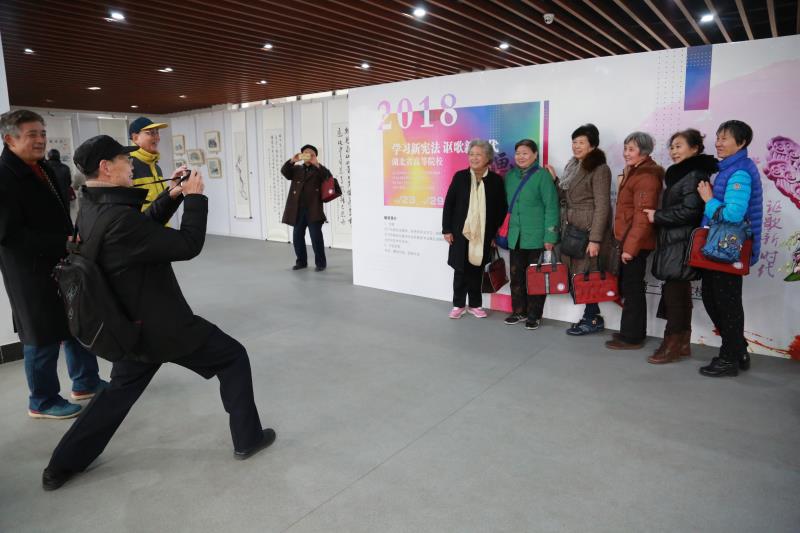 丹青歌盛世,墨宝颂华章。12月25日上午,以“学习新宪法,讴歌新时代”为主题的省高等院校书画作品展在我院图书馆正式拉开帷幕,各界书画专家聚集我院图书馆赏鉴省高校师生书画作品。