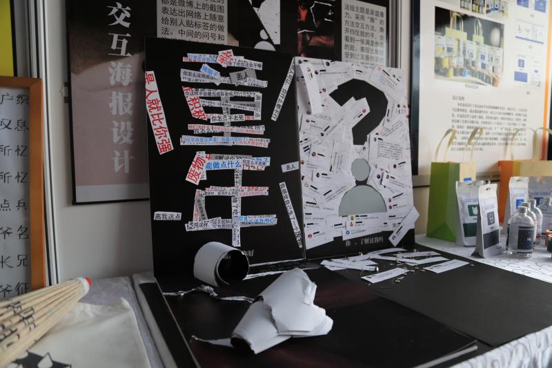 据艺术学部周老师介绍,作品《请停止伤害》——交互海报设计是本次展品的亮点之一。周老师说:“参展作品一般都是静态的,观众只能观看和感受,而这个作品把装置艺术的装置互动性概念运用到了张贴海报里,观众在触碰和撕动它的时候可以和它互动, “交互”是作品《请停止伤害》最精妙的地方。目前大多数是通过新媒体的方式呈现,用实体方式的非常少,实体方式的互动性让观众感受更强烈一些。”