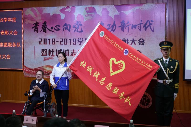 经与杜诚诚商议,学院决定成立“杜诚诚志愿服务队”。5月9日晚,“杜诚诚志愿服务队”正式成立并举行了授旗仪式,由杜诚诚向“杜诚诚志愿服务队”授旗。在志愿服务队队长范书延带领下,全体志愿者进行了庄严的宣誓。