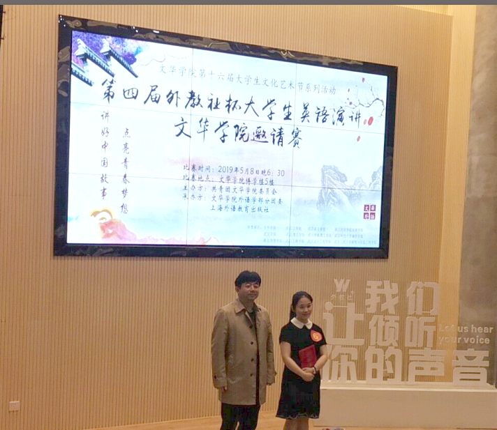 新闻网讯 第四届“外教社杯”湖北省民办高校大学生英语演讲比赛于5月8日晚在文华学院举行。我院外语学部学生向文隽、胡陈一参赛,分别荣获特等奖和二等奖。