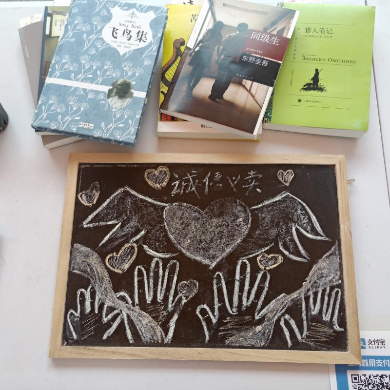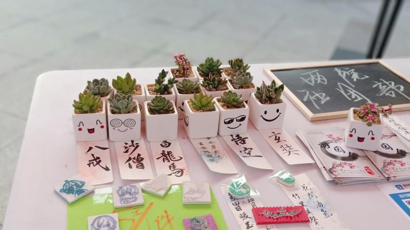 学生社团手制的小礼物、通过节能环保废物利用做出的小物件,安安静静地摆在南一教学楼与图书馆之间的诚信义卖摊点,废旧书本,可爱的小盆栽,书协挥笔书画的小书签、小扇子、手刻橡皮章等等,将环保、绿色的理念和古老的诚信精神融入其中。