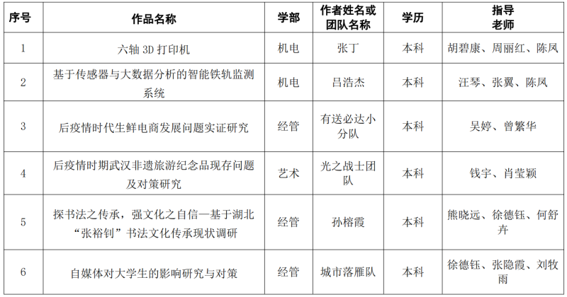 湖北省第十三届“挑战杯·中国银行”大学生课外学术科技作品竞赛拟授三等奖名单