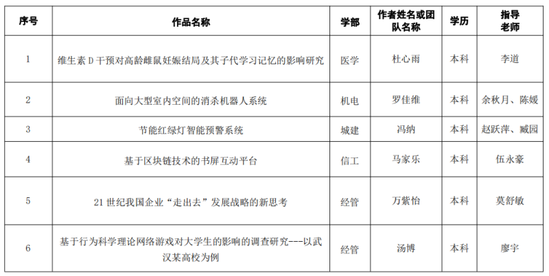 湖北省第十三届“挑战杯·中国银行”大学生课外学术科技作品竞赛终审决赛入围名单