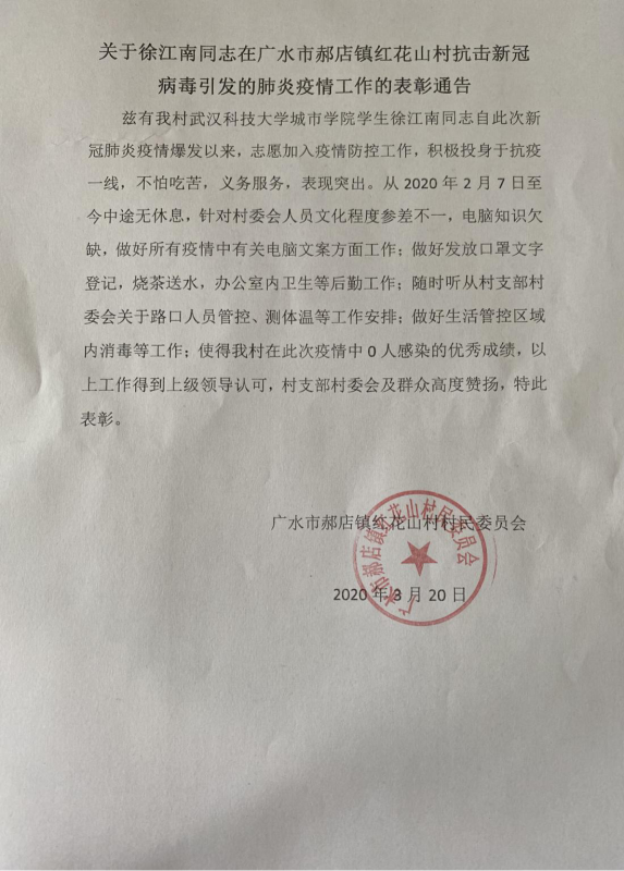 2020年初,面对突如其来的新冠肺炎疫情,徐江南主动投身疫情防控一线,用实际行动服务社区群众。辅导员刘建国得知他在社区当志愿者后,关切地告诉他:“在疫情防控工作中为人民群众服务的同时一定要保护好自己,要学会在服务他人、奉献社会中成长进步。”长达51天的疫情防控工作,徐江南得到了当地政府及社区群众的高度赞扬,他以实际行动为班级同学树立了榜样。
